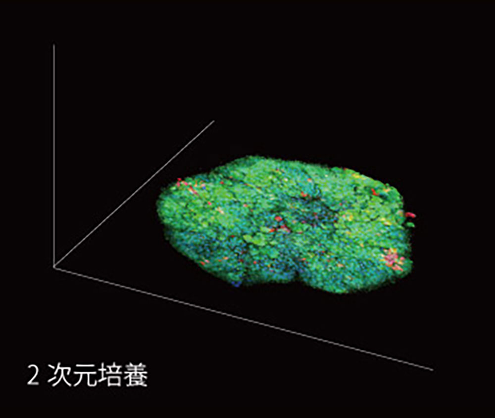 二维培养中细胞呈平面接触,细胞间的刺激传导仅为横向。培养基和药物从上方直接供应。