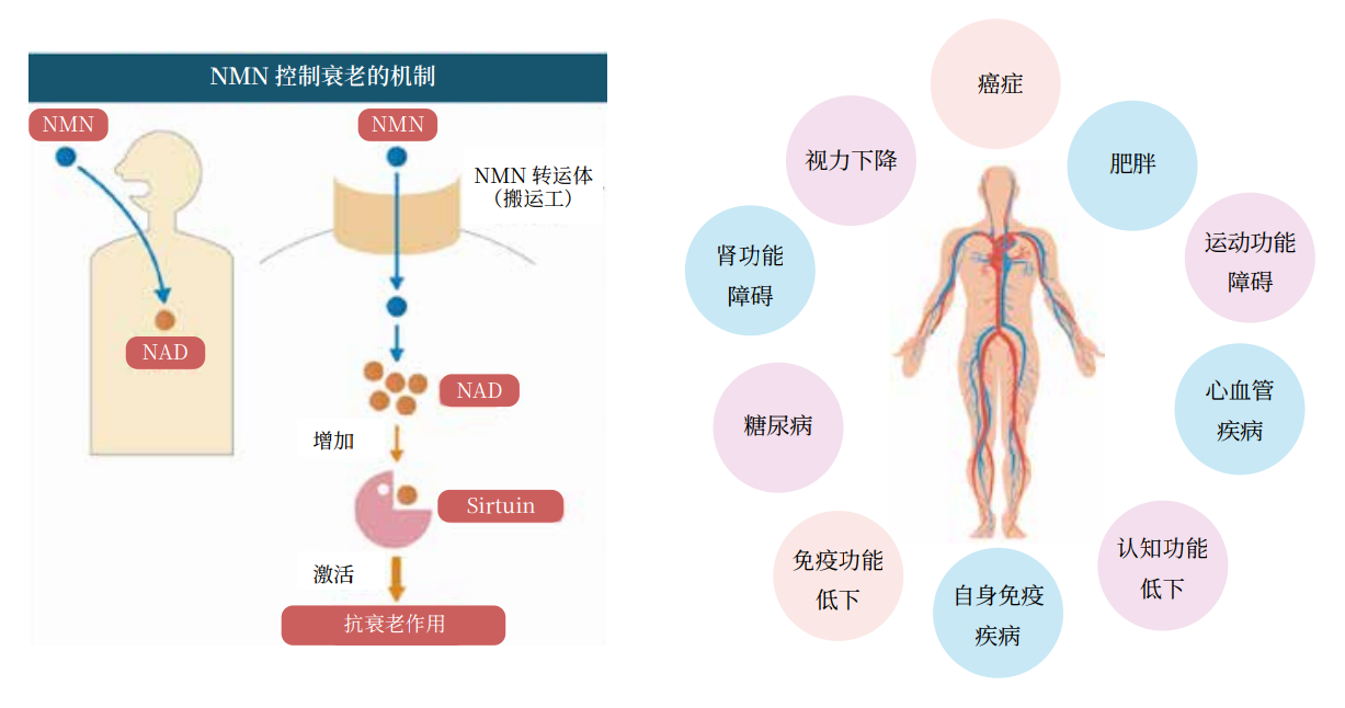据研究报告,通过让阿尔茨海默病的模型小鼠服用NMN 后,恢复记忆力和认知功能,抑制了导致阿尔茨海默病的大脑海马的细胞死亡。在世界各国非常多的研究机构的论文中证明了,NMN 具有维持血管弹性和年轻的时候一样的作用等,改善了随着衰老机体组织和内脏器官的功能降低,并且改善了随着衰老发生的疾病等的效果。